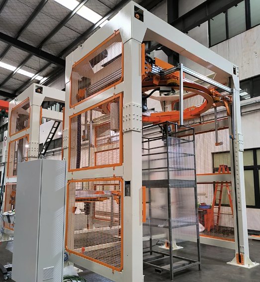 Fully automatic High-speed rotary ring pallet Stretch Wrapping Machine is a kin of high-speed rotary arm wrapping machine. The circular cantilever design reduces the centrifugal force after high-speed operation and makes the operation more stable. This high-speed vertical ring winding machine is suitable for supporting assembly lines, which are relatively inconvenient to move goods and use in production lines that require very high packaging efficiency. The main electrical components are controlled by SEW servo motor and Siemens PLC, and the intelligent touch screen setting port makes the operation easier. Multiple protective safety devices and intelligent alarm system escort safe production. The top pressing function can be added to be compatible with the packaging needs of various industries.